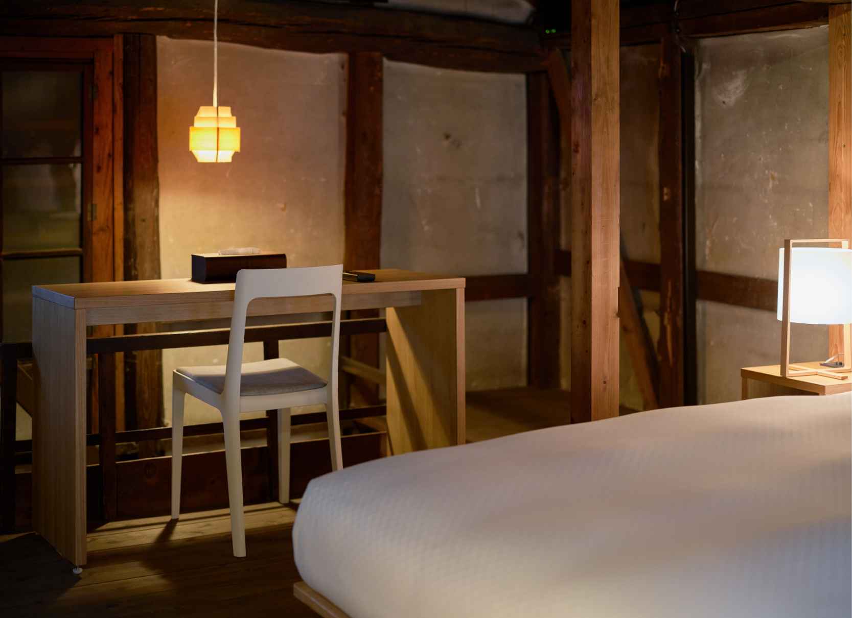 TVや時計、明々とした照明を置かないことで、日常の喧騒を離れたゆっくりしたひと時をお過ごしいただけます。また現代の快適性を加えつつ、できるだけ当時の空間を残しています。