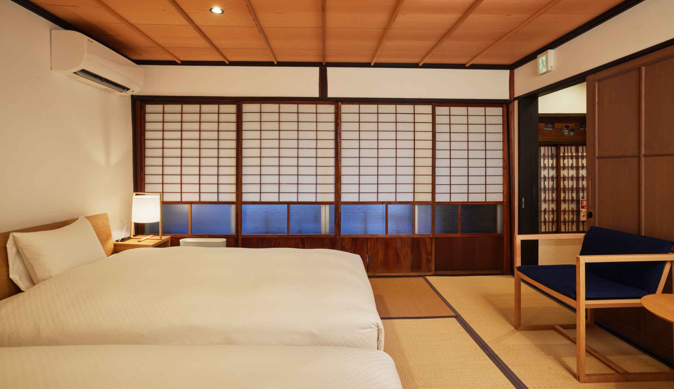 | 客室備品/アメニティ | サータ社製ベッド/バスルーム/高速インターネット回線(WiFi)/冷蔵庫/ミニバー/電気湯沸しポット/ヘアドライヤー/洗浄機能付きトイレ/金庫(一部客室を除く)/加湿器/タオル類/パジャマ/足袋/スリッパ/歯ブラシ/シャンプー/コンディショナー/ボディタオル/ボディソープ/石鹸/スキンケアセット/コットン/綿棒/ヘアブラシ/シャワーキャップ/髭剃り |